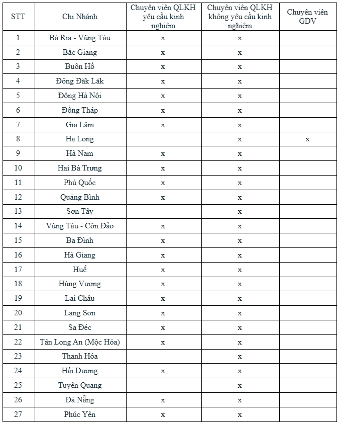 - Mỗi ứng viên chỉ nộp hồ sơ cho 01 vị trí tại 01 chi nhánh. Trường hợp ứng viên cố tình nộp cùng lúc tại các chi nhánh hoặc vị trí khác nhau, BIDV sẽ chủ động loại bỏ hồ sơ để đảm bảo 01 ứng viên chỉ thi tuyển 01 vị trí tại 01 chi nhánh.